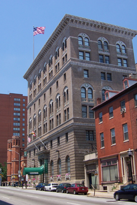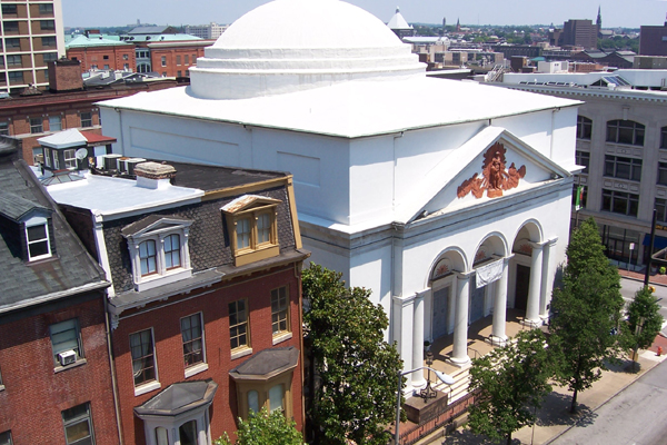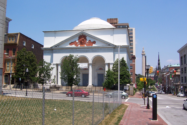 The front entrance to the church is located on the corner of Charles and Franklin Streets.