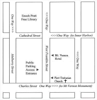 The front entrance to the church is located on the corner of Charles and Franklin Streets.